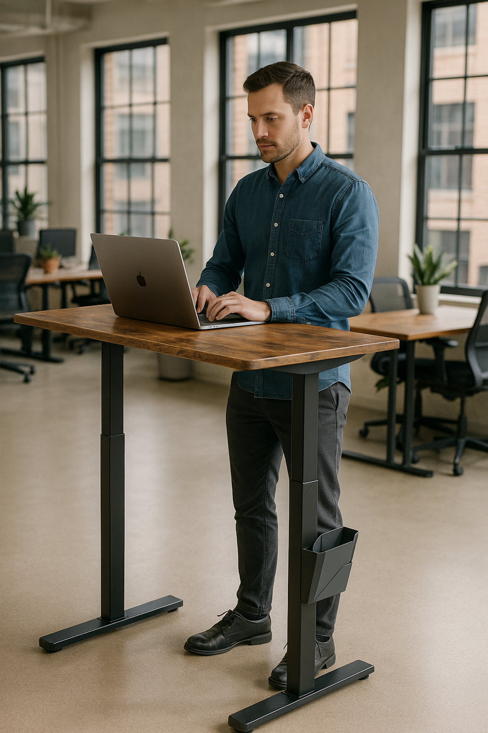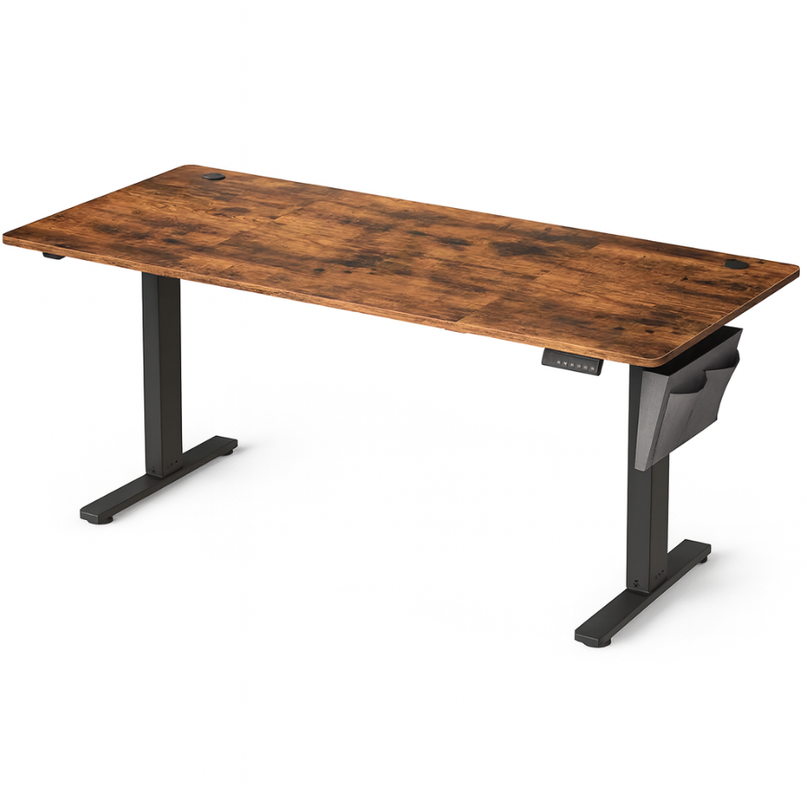 Bureau assis-debout électrique avec plateau en panneau composite finition effet bois. Dimensions adaptées à un poste de travail complet. Structure en acier avec base en T et patins de protection. Réglage en hauteur motorisé, commandé par un panneau intégré avec fonctions de mémorisation. Deux passe-câbles circulaires intégrés pour l’organisation du câblage. Compartiment latéral fixé à la structure pour accessoires ou documents. Plateau d’épaisseur standard, conçu pour un usage bureautique courant. Surface de travail adaptée à plusieurs écrans et périphériques. Système de levage électrique conçu pour supporter une charge de bureau standard. Installation nécessitant l’assemblage de la structure et la fixation du plateau. Le bureau présente des dimensions de 180 x 80 cm et un poids de 30 kg.